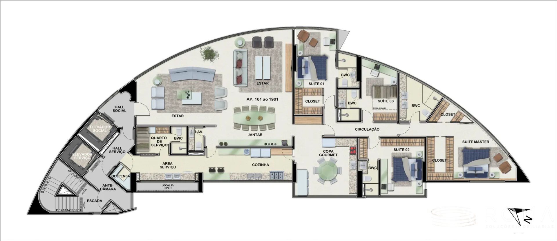 Com 268 m², este apartamento foi pensado para quem valoriza amplitude, conforto e momentos em família. São 4 suítes, garantindo privacidade e bem-estar para todos, além de uma planta que favorece integração e fluidez nos ambientes.